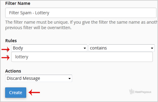 5. In the filter rules, you can filter email with many options, and should you want to deal with email, which contains a word like Lottery or other words, then in the first list box select Body and select Contains in the second list box.